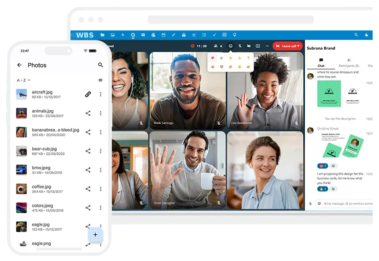 - Messagerie d'entreprise intégrée: chat, appels, visio et partage d'écran.